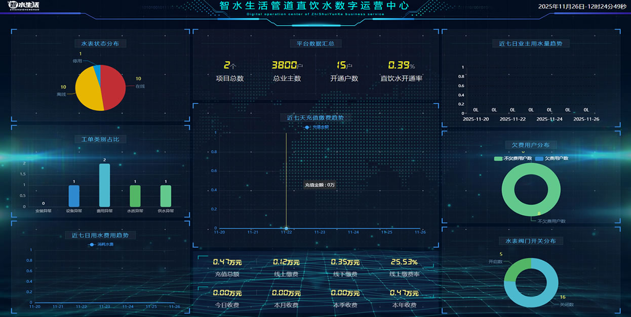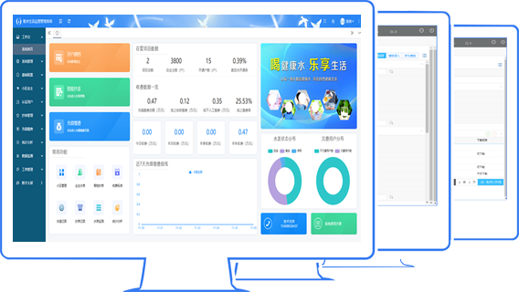新户安装、设备管理与监测、用户管理、用户充值、营销管理、数据统计及分析等功能,对管辖的小区、开通饮水用户、在线缴费、水表远程物联网在线抄表、水质检测分析、工单报事报装、充值缴费活动优惠、数字运营决策分析。